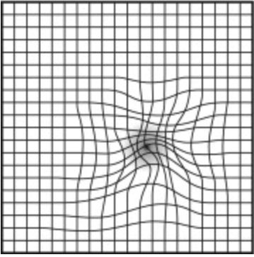 The Amsler grid is simply a piece of paper with a grid of straight horizontal and vertical lines printed on it. With one eye closed, the grid is held 11 inches (28 – 30 cm) from the open eye. Looking straight forward in the direction of the central dot, the patient observes, without looking away from the dot, for any wavy lines or distortion anywhere in the area of their central vision .